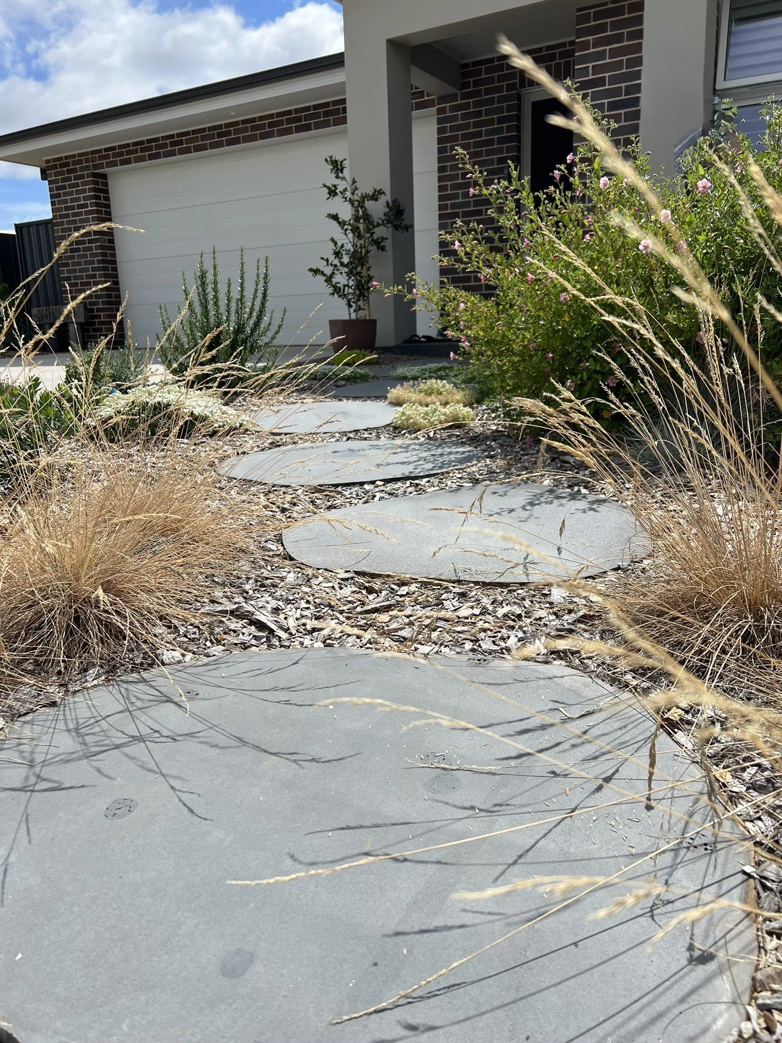 Returning clients, Sandy and Col came back for help to plan their ‘downsized townhouse garden’. Following through on a similar theme from their last suburban garden design, the use of rustic materials, hardy native plants & allocation of ‘zones of use’, allowed Colin to utilise his enthusiasm and skilled technical hand to bring this small garden project together with the help of Sandy (to keep the boundaries in place) and John Anderson, landscaper extraordinaire, who has mastered the art laying Crazy Pave.